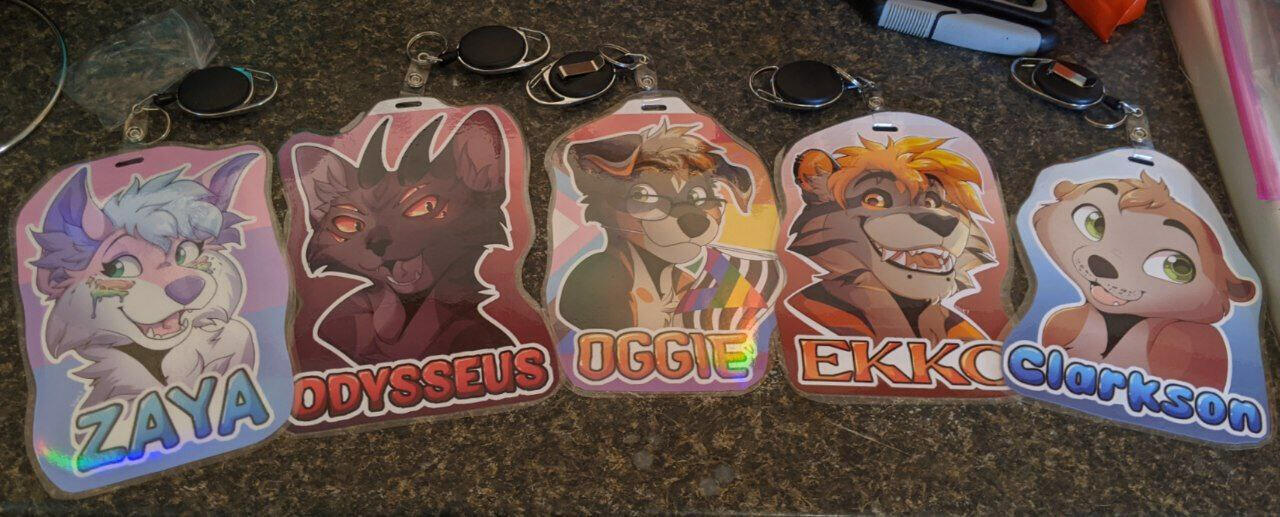 Fully shaded badge featuring your character and their name, with a simple patterned background. Printed badges come laminated and shipped to your door, and a QR code on the back to my socials (and yours, if requested!). Comes with surprise goodies, and shipping is included to anywhere in the world!All badges come with a free retractable keychain attached.