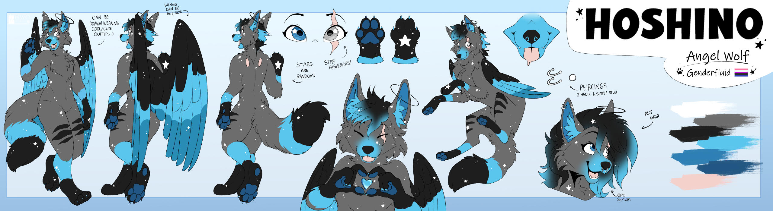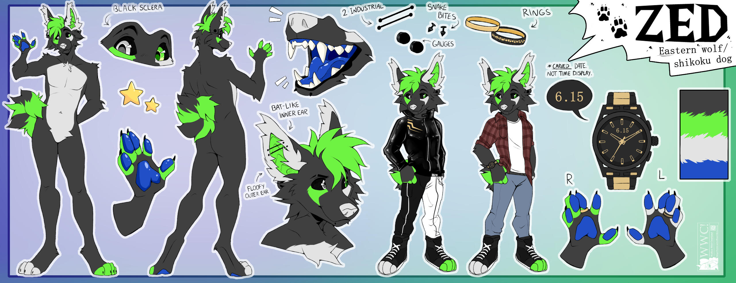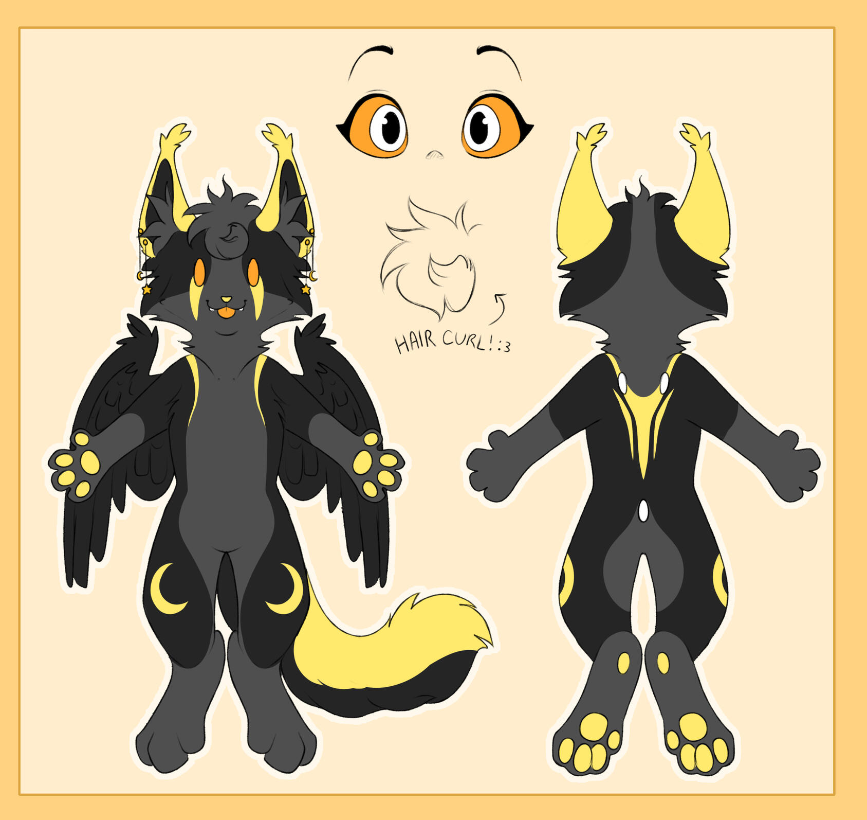 An unshaded reference sheet with a front and back view of your character. It can include an extra fullbody with a clothing option, or a wings showcase option (if applicable). It also includes a bust, a headshot, a feral fullbody, and extras such as eyes, paws, and mouth closeups.